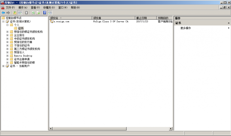 开始 -〉运行 -〉MMC,启动控制台程序 -> 选择菜单“文件 -〉添加/删除管理单元”->列表中选择“证书”->点击“添加”-> 选择“计算机帐户” ->点击完成。在控制台的左侧显示证书树形列表,选择“个人”- “证书”,右键单击,选择“所有任务-〉导入”, 根据“证书导入向导”的提示,将.pfx格式文件导入,注意导入过程选择“根据证书内容自动选择存储区”。(注意导入过程中需要输入密码)导入成功后,刷新,可以看到如图1所示的证书信息