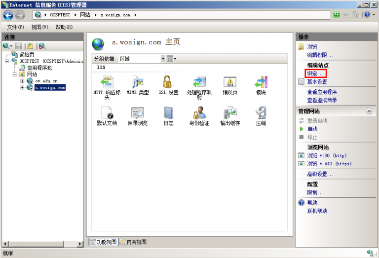 打开IIS7.0管理器面板,找到待部署证书的站点,点击“绑定”如下图所示: